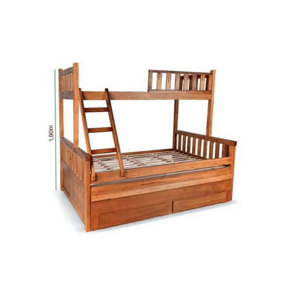 Possui uma cama de solteiro na parte superior, uma cama de casal na parte inferior e uma cama de solteiro auxiliar.