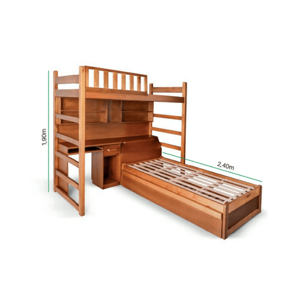 Conta com cama superior e, na parte inferior, cabeceira com escrivaninha integrada e prateleiras, trazendo mais praticidade para o dia a dia.